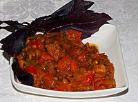 - кулин. овощное блюдо грузинской кухни из стручковой фасоли, баклажанов, помидоров, сладкого перца, репчатого лука, чеснока, растительного масла и пряных трав ◆ Отсутствует пример употребления (см. рекомендации).