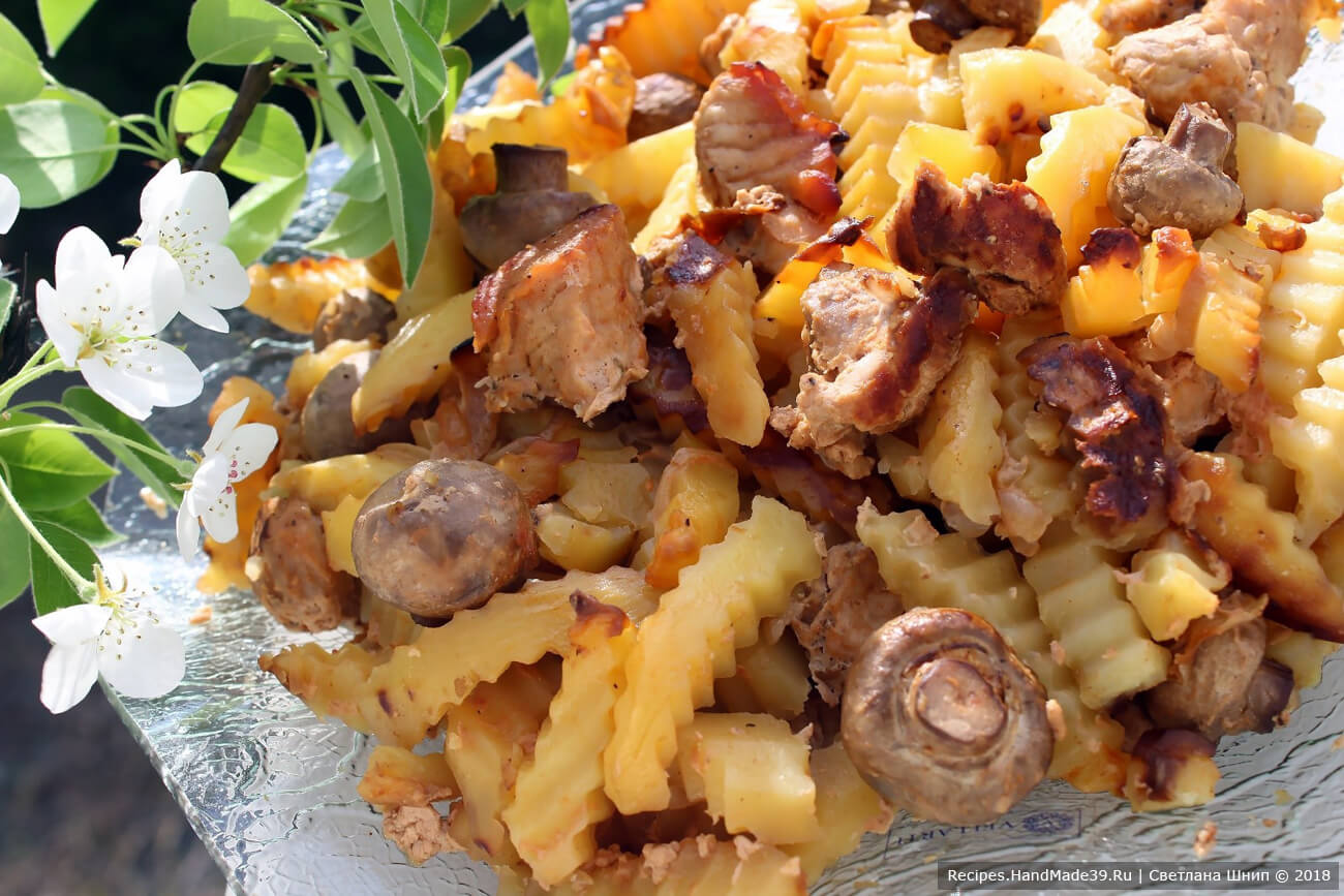 Мясо получается нежным и с румяной корочкой, грибы — сочными. Завершает вкус соус из белого вина. …далее