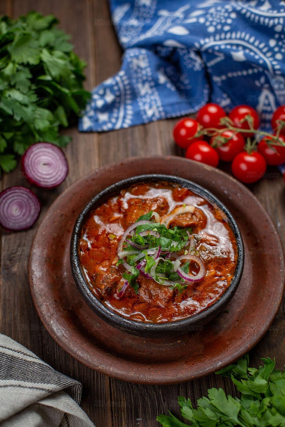 В Грузии принято подавать чашушули на кеци — толстостенной сковороде из красной глины с невысокими бортами. Но у меня такой не оказалось, поэтому просто разложила порционно мясо. Сверху положите порезанный тонко красный лук и зелень. Подавайте к столу!