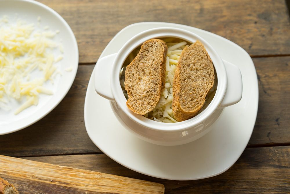 Также классический рецепт супа подразумевает подачу блюда со специальными чесночными гренками. Для этого из багета делают гренки, подсушивая в духовке и натирая чесноком. В готовый французский луковый суп добавляют гренки и посыпают тертым сыром.
