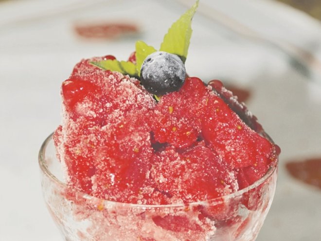 Должна получиться ледяная стружка. Убрать в морозильник еще на 30 минут. Повторить это действие еще 2-3 раза. Готовая гранита должна состоять из довольно крупных ледяных кристаллов. - За час до подачи еще раз перемешать граниту вилкой и убрать в морозильник. Это придаст граните необходимую хрустящую текстуру.