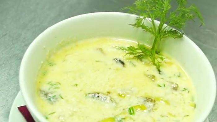Посмотрите пошаговый видеорецепт — Cырный суп с курицей и грибами