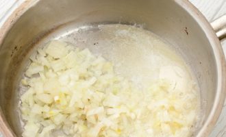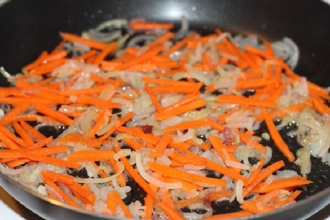 - Растапливаем на сковородке сливочное масло и добавляем мелко нарезанные морковь и лук. Когда зажарка приобретет нежно-золотистый цвет, она готова.