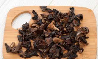 - Сушеные грибы кладем в миску, заливаем холодной водой и оставляем на время, пока они набухнут. Промываем грибы, мелко нарезаем.