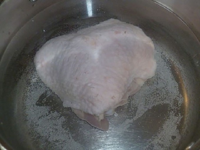 - Курицу заливаем холодной водой, доводим до кипения, варим 5-10 минут, сливаем воду и заливаем заново, ставим на плиту. К курице в кастрюлю кладем очищенный чеснок. После того, как вода закипит, варим курицу 15 минут.