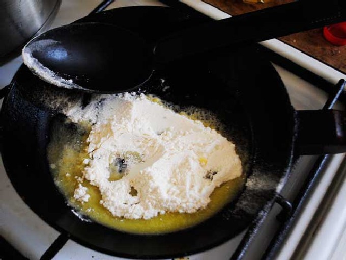 - На сливочном масле обжариваем муку, постоянно помешиваем, затем по столовой ложке вливаем на сковородку бульон из кастрюли, хорошо перемешиваем, избегая образования комков. Перекладываем муку в бульон и перемешиваем.