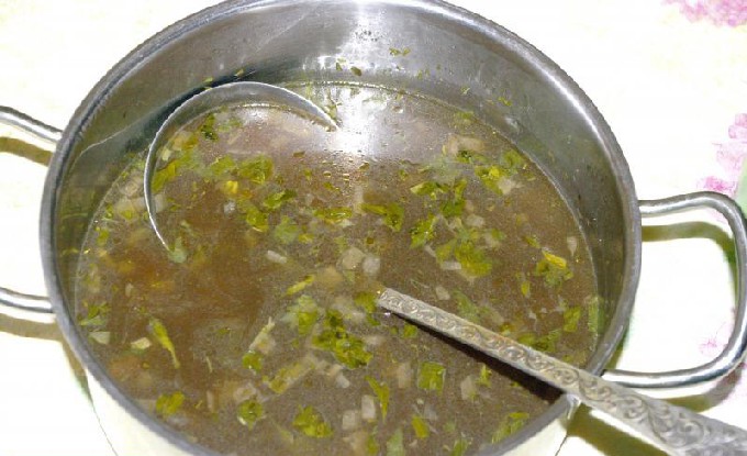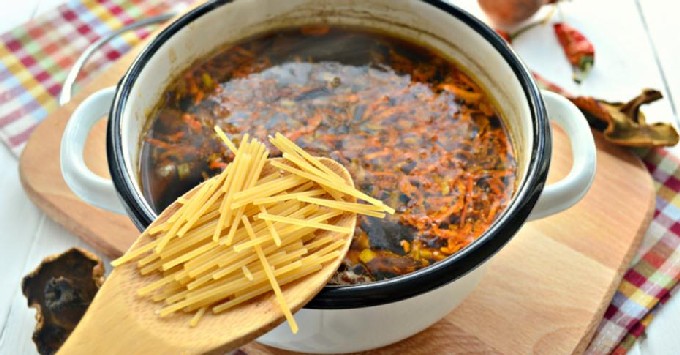 - Предварительно, на 2 часа до готовки замачиваем грибы, добавляем в мясной бульон, варим около 30 минут, процеживаем супчик.