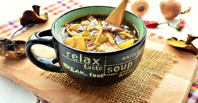 Ароматный суп из сушеных грибов, приготовленный в мультиварке