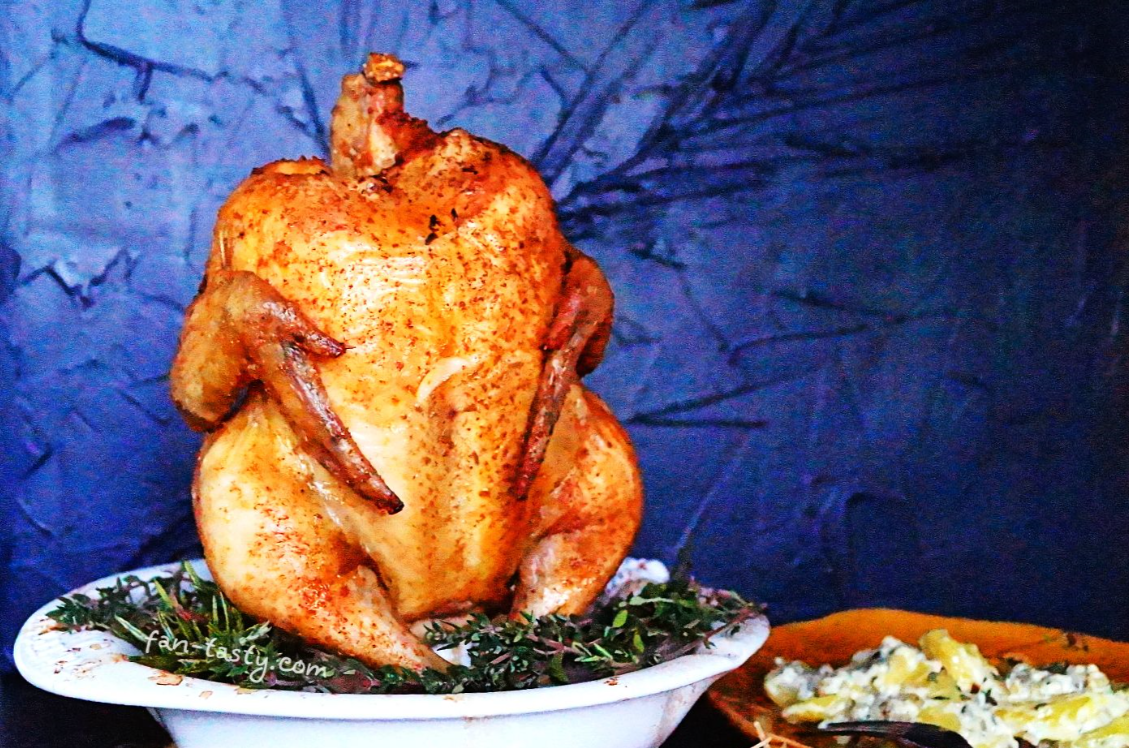 Заполните его наполовину холодной водой. Ставьте запекаться курочку в холодную духовку, чтобы вода равномерно нагревалась и бутылка не лопнула. Включите духовку до 200 градусов. Через полчаса уменьшите до 180 и запекайте в течение 1,5 часов.