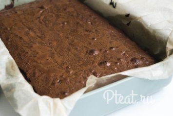 - Берем форму, в которой будет выпекаться наш американский «Брауни», застилаем ее пергаментной бумагой, смазываем сливочным маслом и выливаем приготовленное по рецепту тесто.