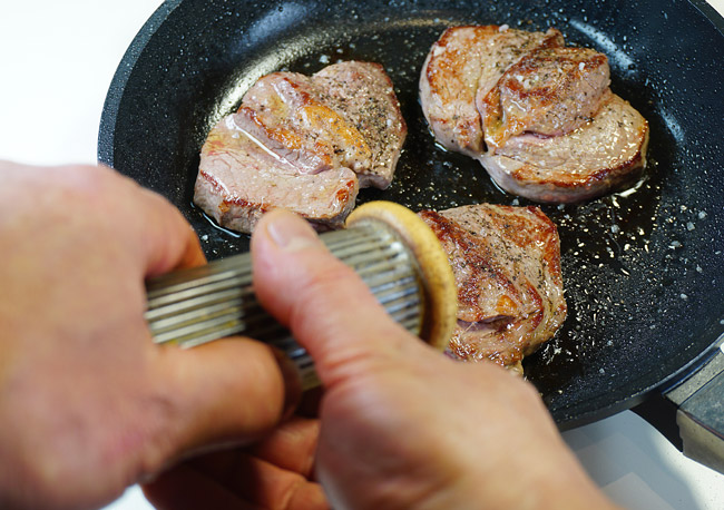 От того, какой рисунок вы хотите получить на стейке, зависит, как его разместить — вдоль или поперёк ребристой плоскости сковородки. Я делаю полоски вдоль. А можно, кстати, дважды сменить направление во время запекании каждый стороны стейка, тогда получается сетка из ромбиков или квадратиков.