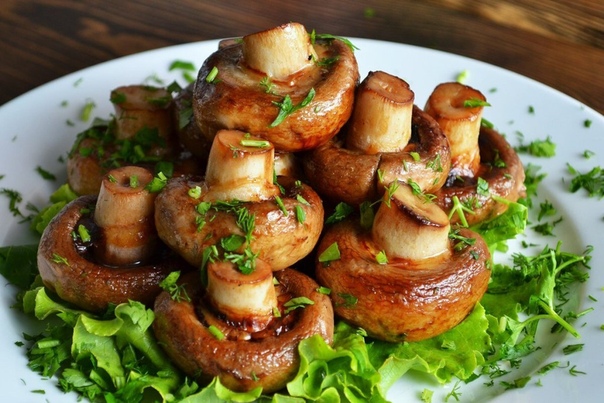 Готовые шампиньоны хороши и как самостоятельное блюдо, поданное с пряной зеленью, так и в качестве гарнира к говядине или курице.