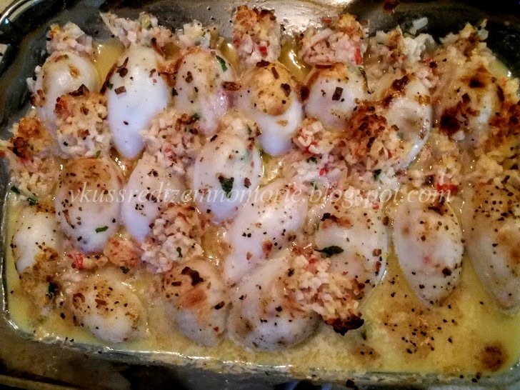 Это блюдо на любителя из-за специфического запаха кальмара. Но тем, кто любит морепродукты, нужно попробовать для фаршировки такую начинку.