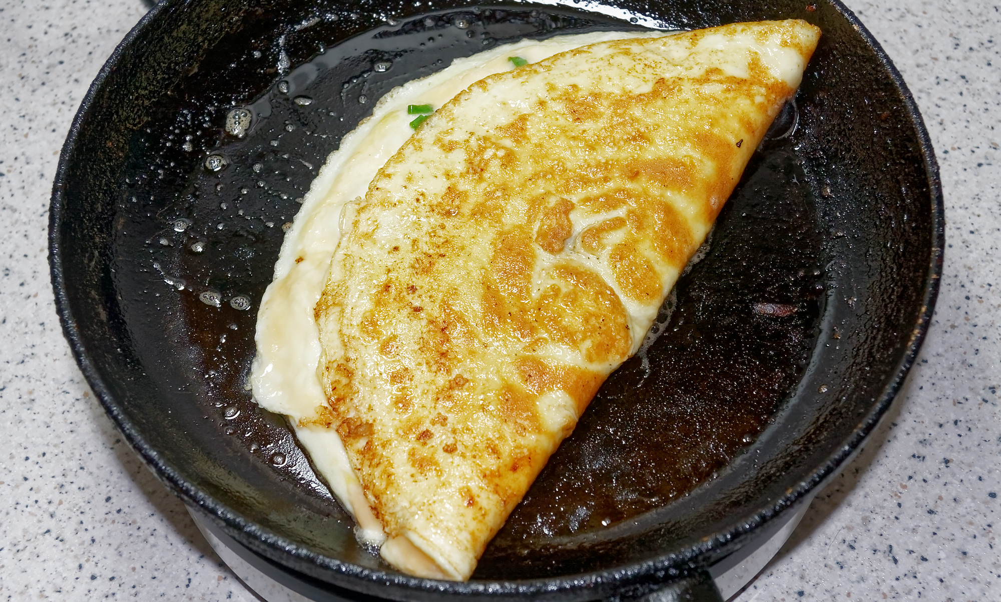 Разрежьте сложенный омлет пополам ребром лопатки. Переверните омлет и дайте ему подрумяниться еще 1-2 минуты.