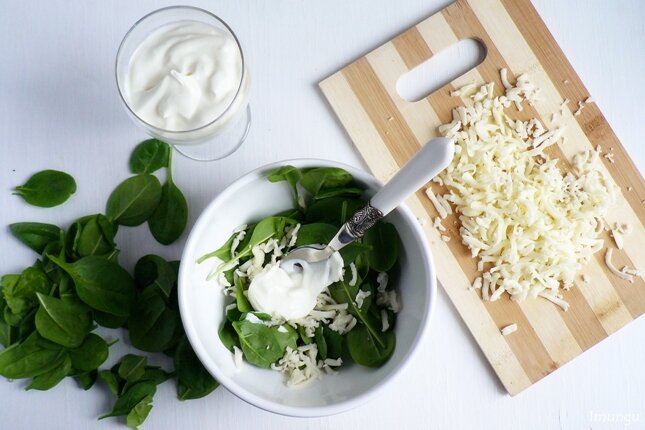 4. В отдельной емкости смешиваем сметану, сыр и шпинат.
