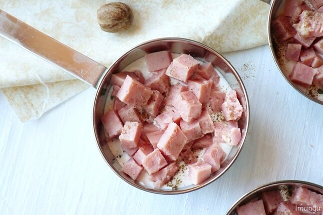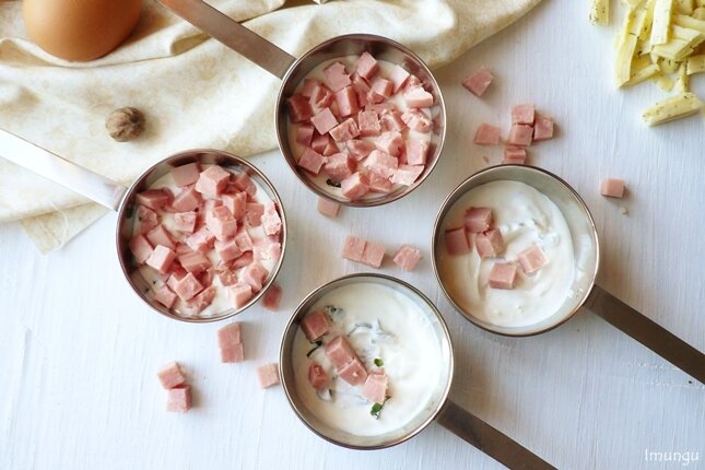 Выложите в каждую кокотницу по столовой ложке сметаны, смешанной с щепоткой порошка карри. Добавьте мелко нарезанной ветчины. Залейте сметану с ветчиной яйцами, посыпьте сверху полутвердым тертым сыром, например эмменталем.