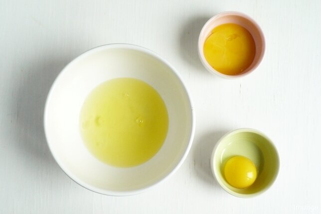 1. Белки отделяем от желтков. Каждый желток помещаем отдельно, белки — вместе.