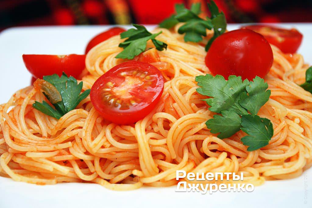 И все, вкуснейшая паста с томатами готова! Подавать блюдо необходимо сразу, в теплом виде.