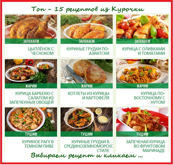 Как видите, на вопрос, что можно приготовить из куры, ответов отыщется не просто много, но очень много. Не менее популярными запросами от начинающих кулинаров остаются: что приготовить из куриной грудки, приготовление курицы в духовке и блюда из куриного филе рецепты которых также имеются в данном разделе.