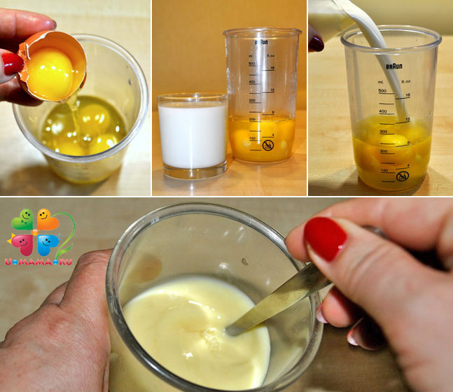 Влить к яйцам указанное количество молока или по индивидуально рассчитанной пропорции.