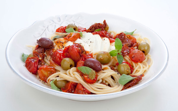 Спагетти с томатным соусом черри, моцареллой и базиликом: (6 порций)