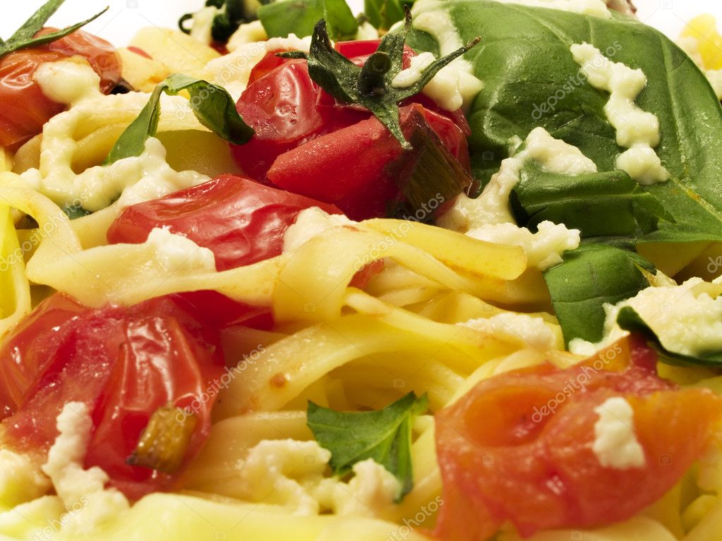 Спагетти с томатным соусом черри, моцареллой и базиликом