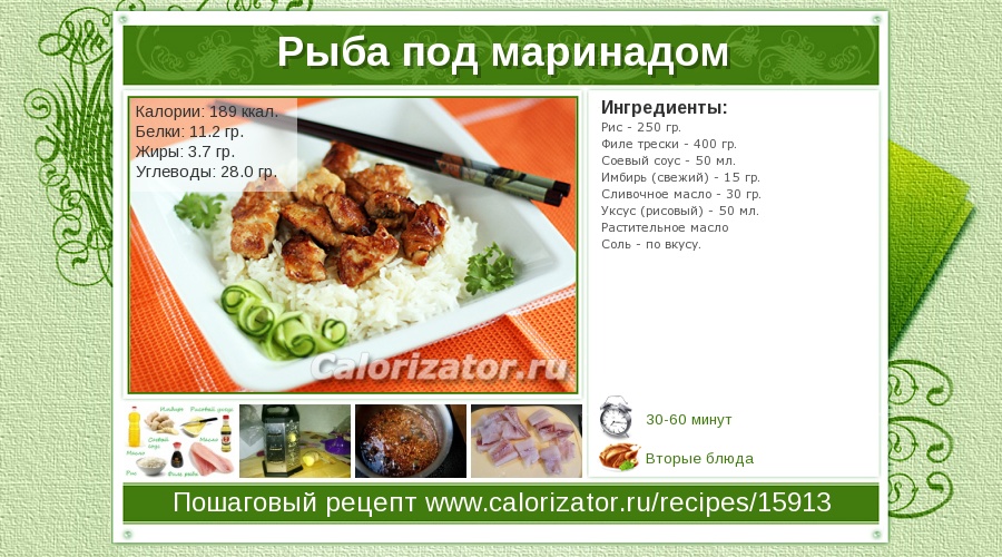 • Π Π΅Ρ†Π΅ΠΏΡ‚ Π Ρ‹Π±Π° ΠΏΠΎΠ΄ ΠΌΠ°Ρ€ΠΈΠ½Π°Π΄ΠΎΠΌ. ΠšΠ°Π»ΠΎΡ€ΠΈΠΉΠ½ΠΎΡΡ‚ΡŒ, химичСский состав ΠΈ пищСвая Ρ†Π΅Π½Π½ΠΎΡΡ‚ΡŒ.