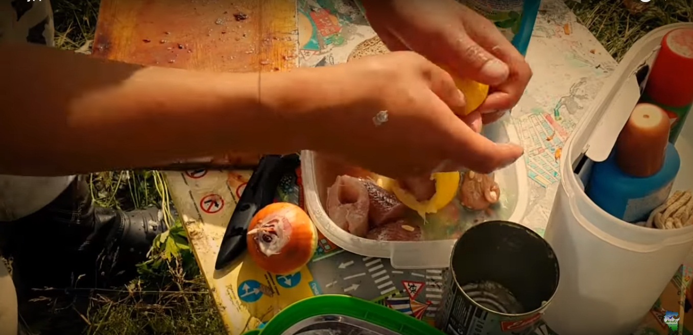 Далее идет самый сложный процесс: правильная быстрая засолка рыбы. Удобнее выбрать стеклянную посуду с широким плоским дном, в походе подойдет эмалированная миска или котелок. Присыпаем полностью дно солью, хороша для таких случаев крупная соль, она не так быстро растворяется от рыбных соков. Затем выкладываем кусочки довольно плотно друг к другу в один слой. Затем снова присыпаем солью уже поверх рыбы. Следом выкладываем второй слой брусков рыбы. Таким слоеным методом пересаливаем всю нарезанную рыбу. Оставляем посуду в местечке потеплее. Если дело происходит на природе в теплое время, то миску ставят на солнышке, прикрыв тканью от насекомых, и засаливают в течение получаса. Если на вас ватничек и толстые носки в сапогах, и на воздухе прохладно, то засолка продолжится вдвое больше. Пока рыбка солится, режем на тонкие колечки пару некрупных луковиц. Хорошо подойдет салатный или красный репчатый лук. У обычного лука-репки слишком жгучий вкус, поэтому его лучше вымочить в воде в течение 7 — 10 минут или обдать кипятком.