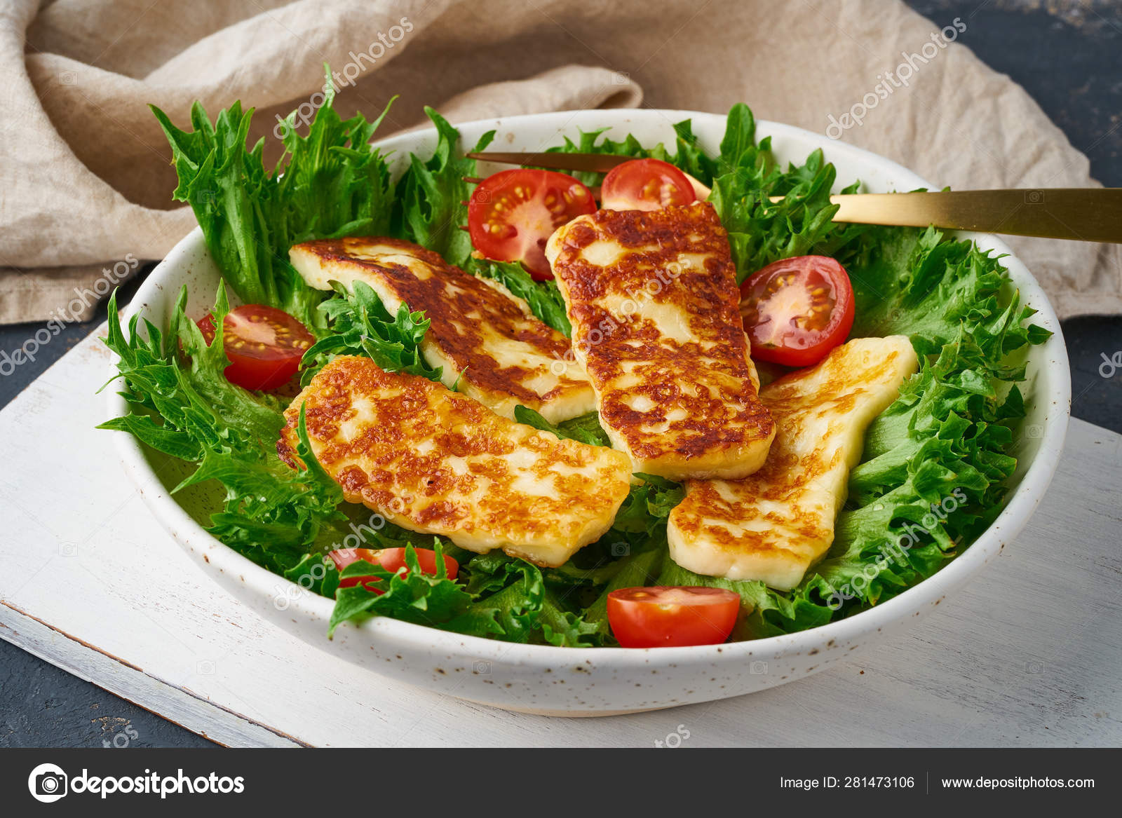 Для приготовления салата Халуми нарезается небольшими кубиками и обжаривается со всех сторон до румяной корочки на оливковом масле. Помимо сыра, для приготовления блюда потребуются следующие компоненты: