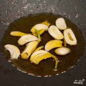 И не теряя времени готовим «изюминку» 🙂 Жарим в оливковом масле чеснок до золотистого цвета и появления характерного аромата в воздухе.