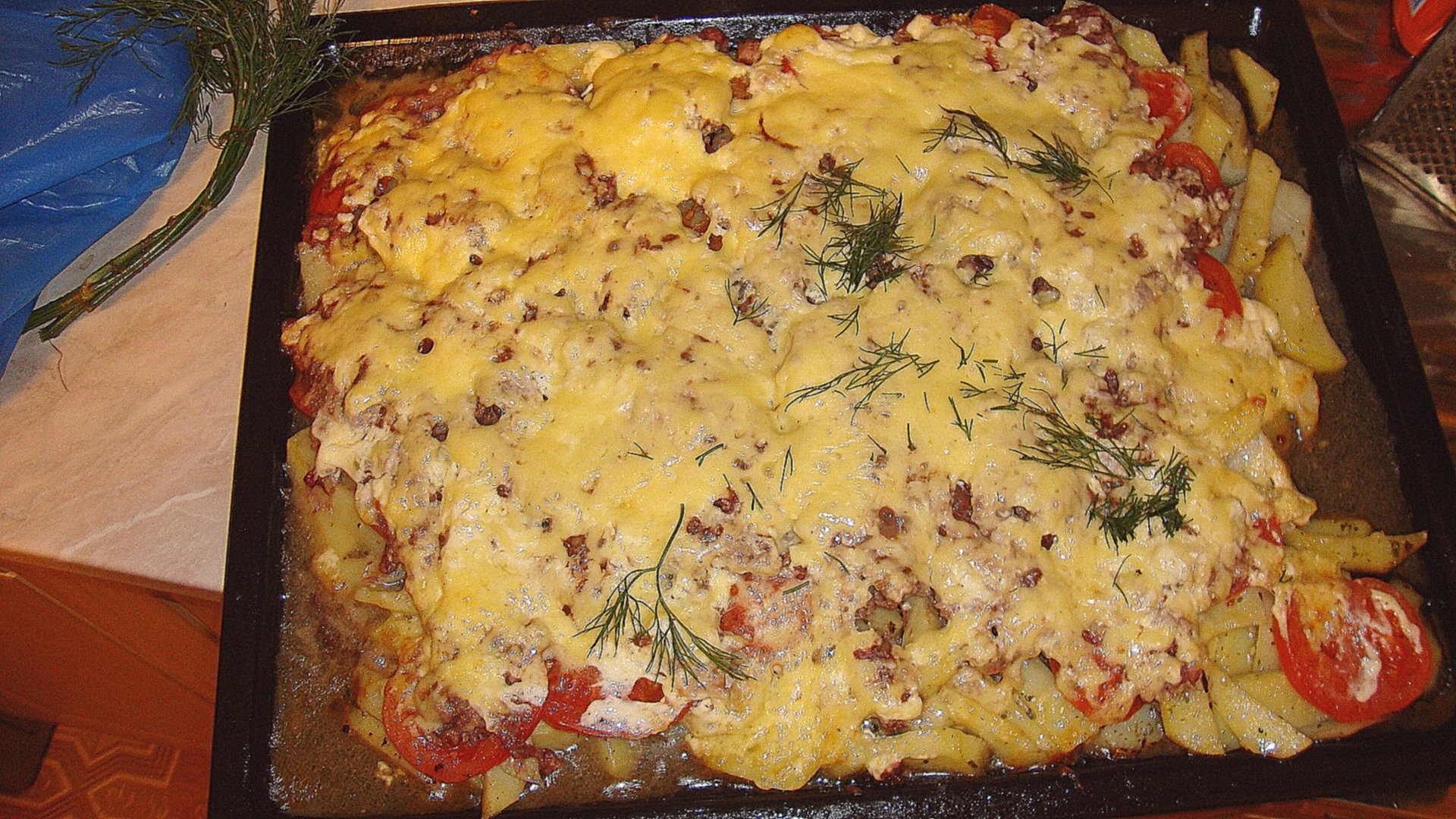 На последнем этапе посыпаем блюдо крупно натёртым сыром, оборачиваем противень фольгой и отправляем в духовку. Лакомство будет готово через полчаса, если выставить температуру в 200 градусов. Приятного аппетита!
