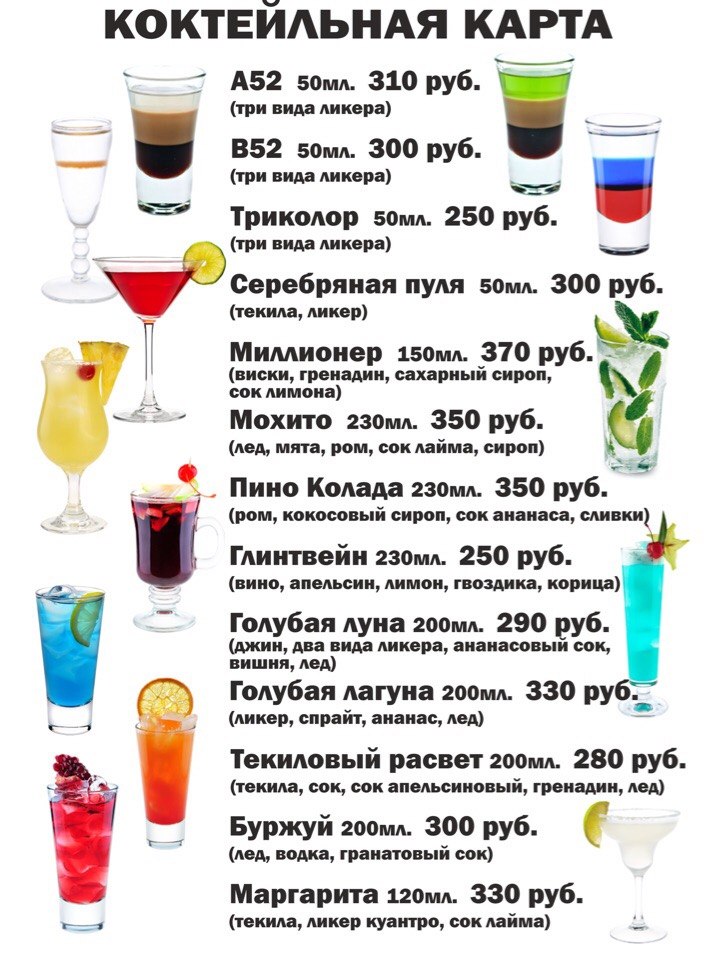 РецептСписок самых популярных барных коктейлей состоит из таких напитков: