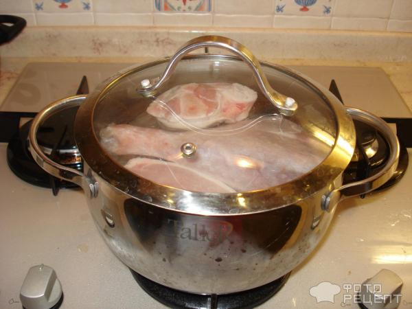 - Голени помещают в кастрюлю и заливают водой так, чтобы ее уровень был на 10 сантиметров выше уровня мяса.