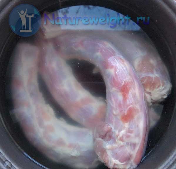 - Мясо помещается в кастрюлю, куда наливается вода. Он должен лишь слегка покрывать ингредиенты.