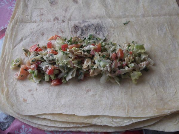 Шаг 13. Лист лаваша кладется узкой стороной к повару, отступив от края 5-6 см, выкладываются овощи, курица и луковые полукольца.