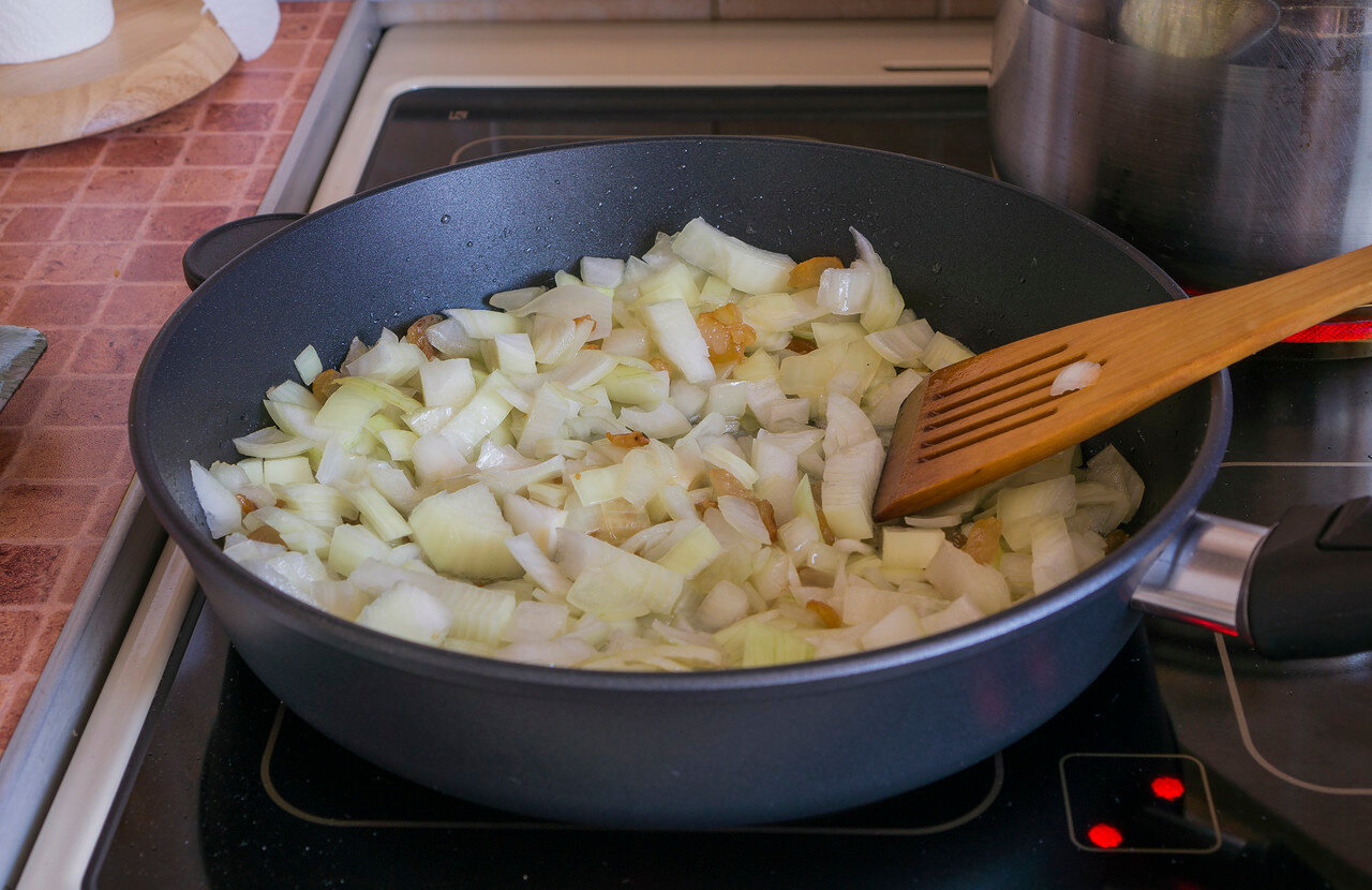 - Обжарить лук. Добавьте лук и обжаривайте на жире от бекона в течение 2-3 минут.