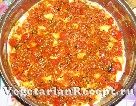 В огнеупорную форму выкладывают немного соуса. На него помещают листы для лазаньи и часть овощного рагу. Все это поливают соусом и посыпают тертым сыром. Слои чередуют до заполнения формы. Важно следить, чтобы последним оказался соус и твердый сыр. Все это накрывают фольгой и убирают в духовку. Запекается вегетарианская лазанья, рецепт которой наверняка окажется на страничках вашей кулинарной книги, при стандартных ста восьмидесяти градусах. Примерно через полчаса ее извлекают из духовки, освобождают от фольги, украшают кружочками помидоров, посыпают сыром и возвращают обратно. Спустя семь минут подрумянившуюся лазанью вынимают из печи. Перед подачей к обеденному столу ее немного охлаждают и режут на отдельные порции.