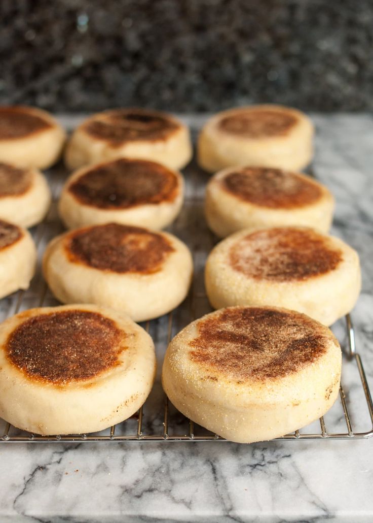 Эти домашние английские кексы, хрустящие снаружи, хорошо прожеванные и с ямочками внутри, — настоящая находка. Что вы будете делать со всеми этими укромными уголками и трещинами, зависит от вас, но вы не ошибетесь, если просто намазываете маслом. Или, может быть, варенье. Или, может быть, яйцо и немного бекона. Или… да, мы тоже сейчас голодны. — Jenny Howard