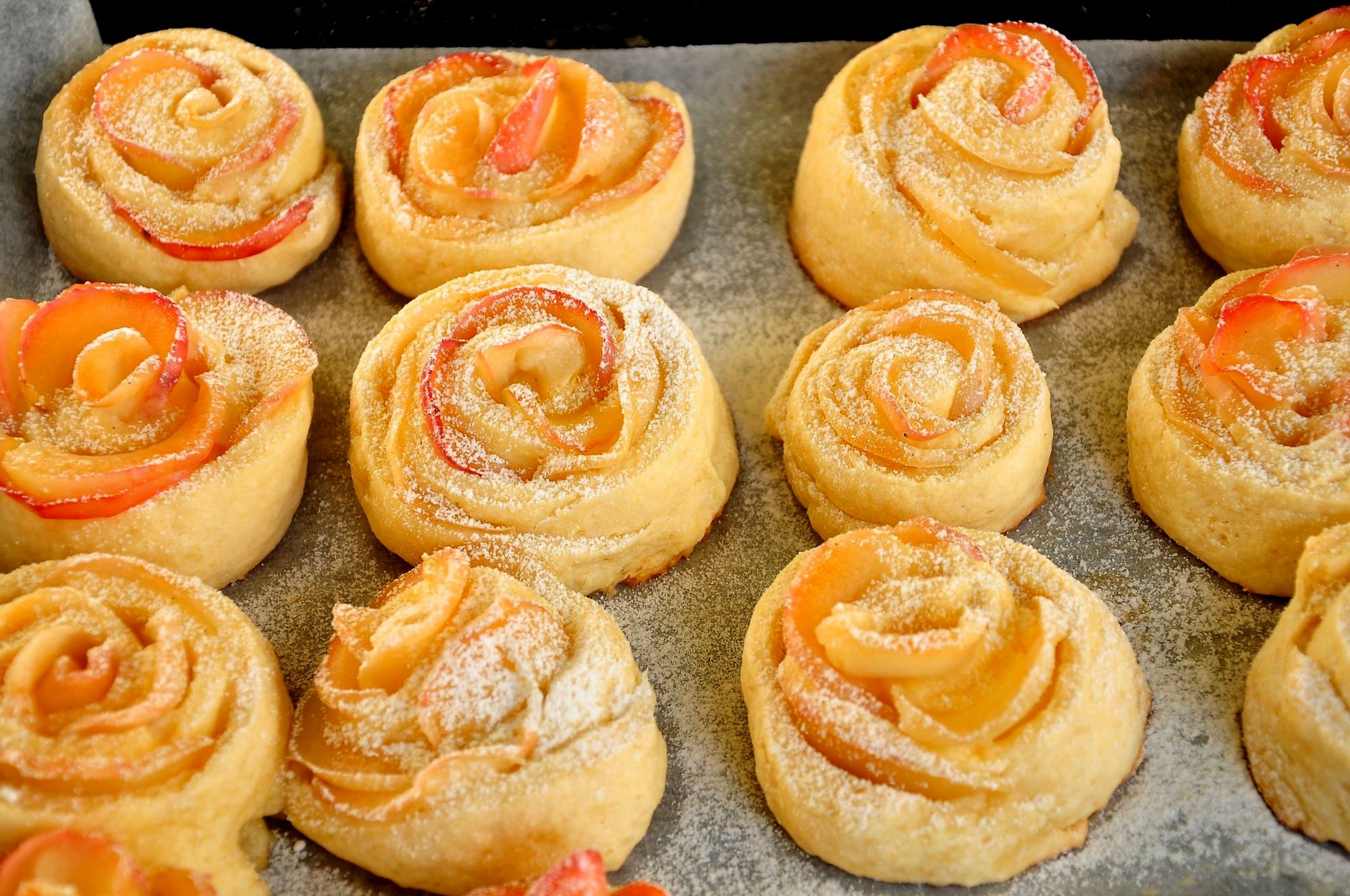 - Рулет нарезают на порции в виде булочек и раскладывают на укрытом пергаментной бумагой противне.