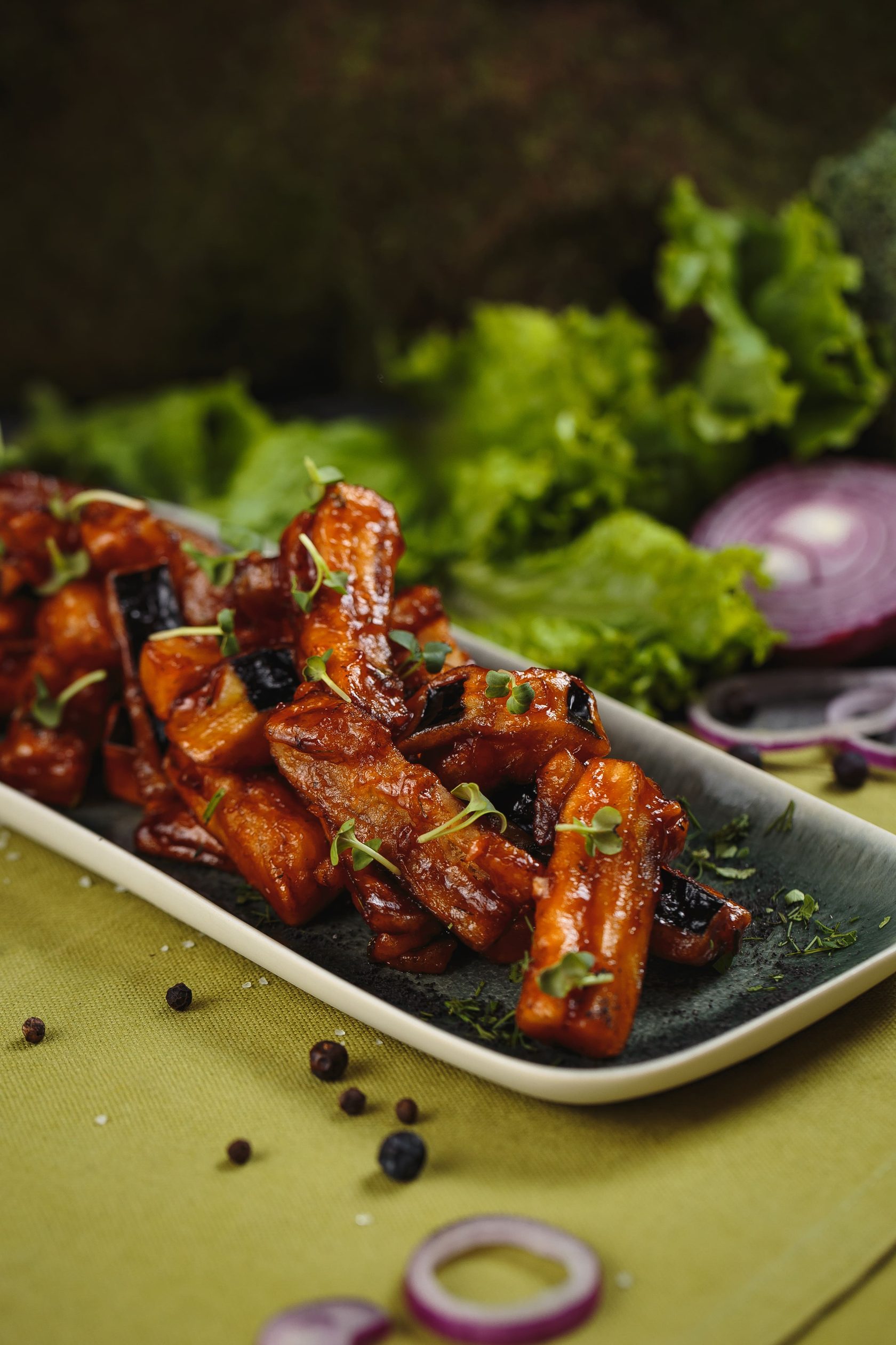 Первым делом необходимо сделать заправку. Для этого соединяем 3 ст. ложки соевого соуса, 1 ст. л. рисового уксуса, 2 ч. ложки имбиря, специи, немного меда, сок лимона, сахарный песок 1 ч.л. Каждый брусочек баклажанчика замачивается на пару минут в карамели и обжаривается на сковороде. Перед подачей полить той же карамельной заливкой.