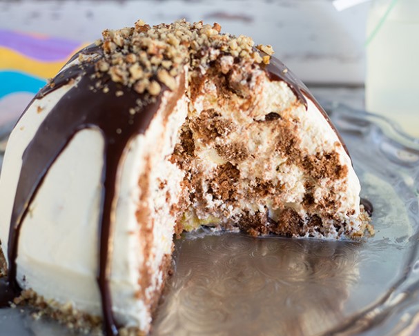 В шоколадном торте Панчо обилие грецких орехов прекрасно сочетается с вишней, сладким нектарином и сметанным кремом.