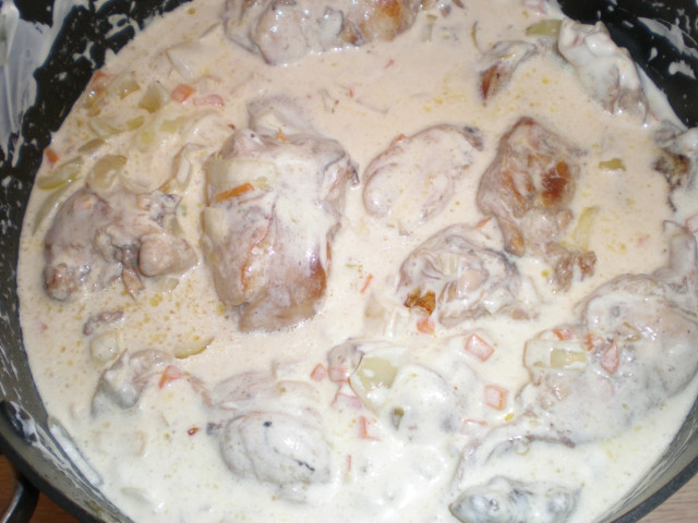 - О соусе: Я оставляю весь жир в жаровне, которую сейчас ставлю на плиту и разогреваю жир. Затем добавляю сметану и загущаю сливочным соусом до нужной консистенции. Затем можно взять немного Магги по вкусу, но кисловатый привкус соуса должен сохраниться.