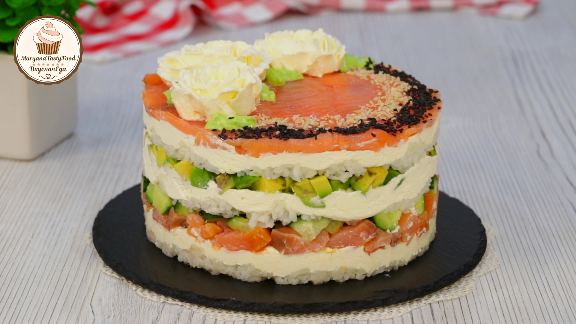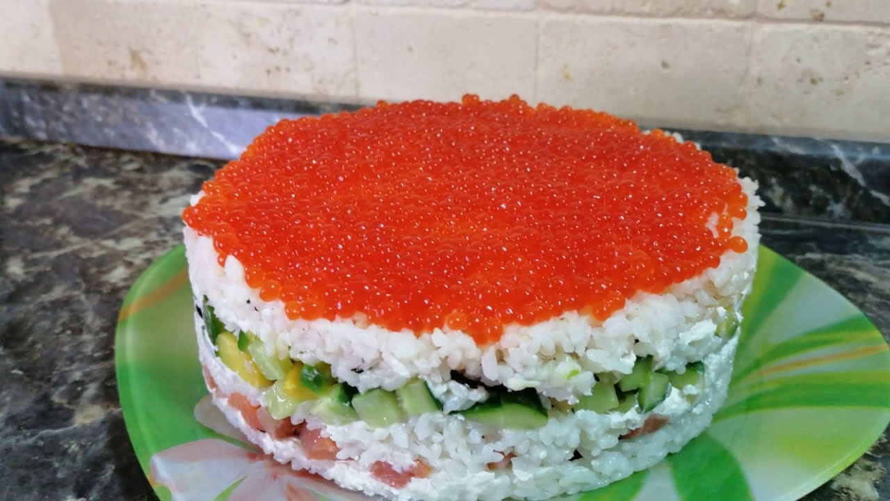 Рецепт и видео: Суши-торт с лососем и огурцом