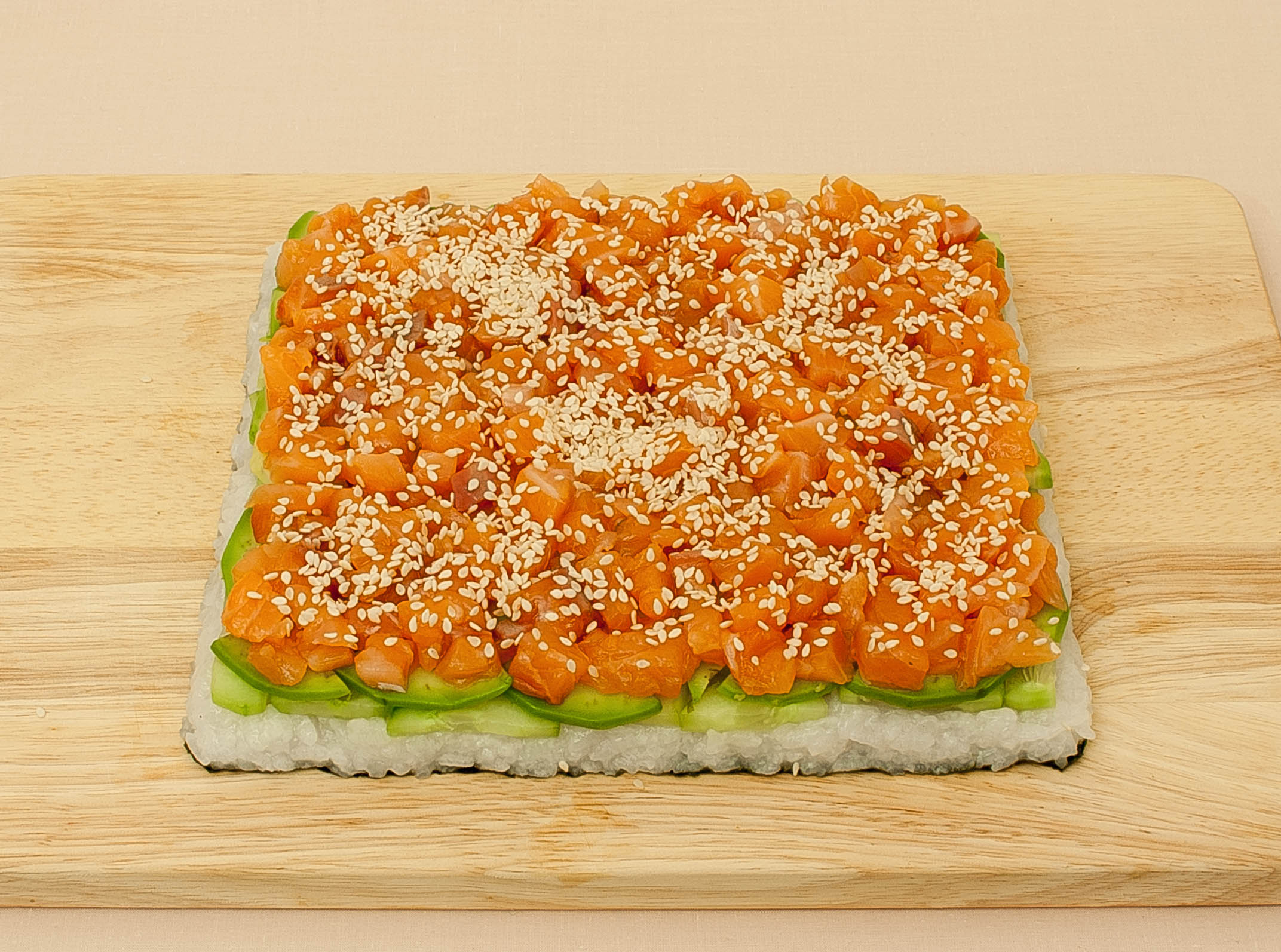 - Если вы используете круглую форму большего размера, не забудьте увеличить количество начинки; иначе ваш суши-кейк будет выглядеть пустым!